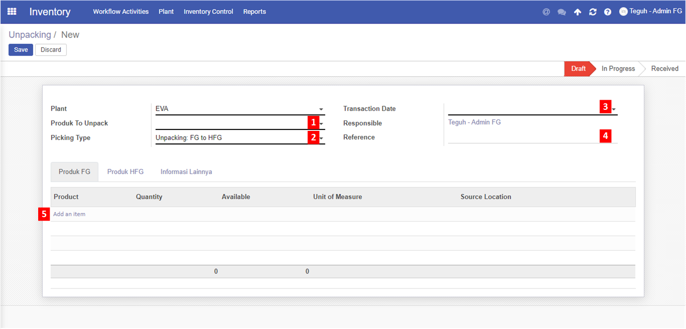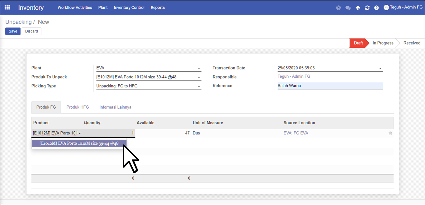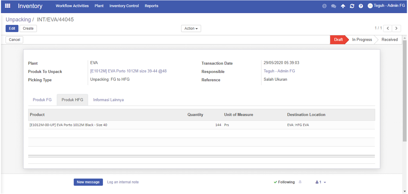 Berikut adalah contoh dari pengisian Unpacking - FG to HFG