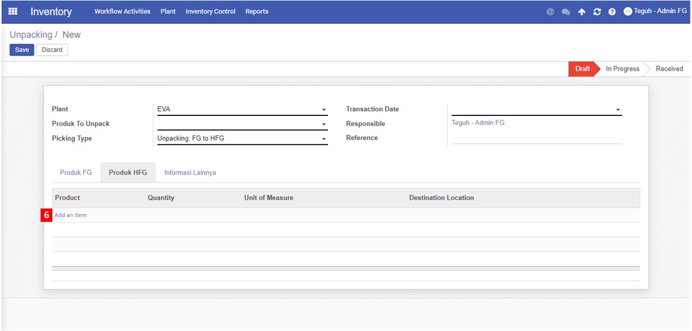 Kemudian Admin FG click pada Tab Produk FG untuk input Add an Item