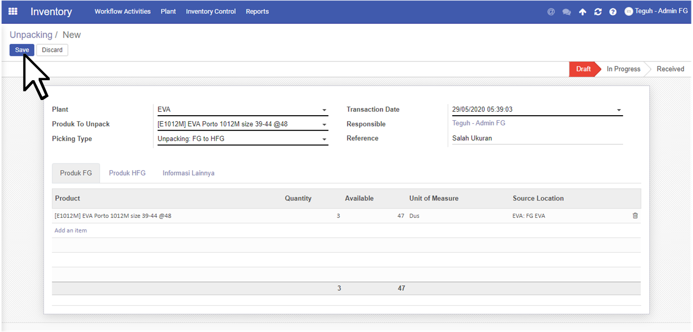 Kemudian Admin FG click Save (sesuai arahan mouse)