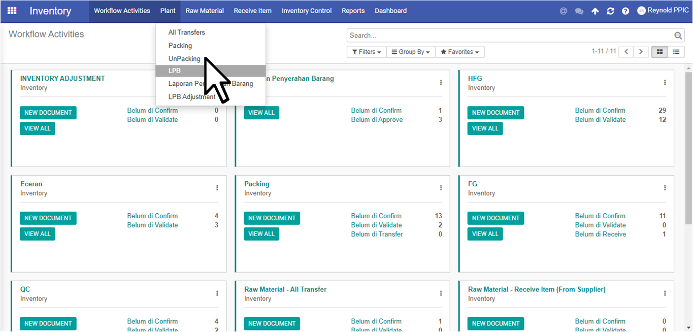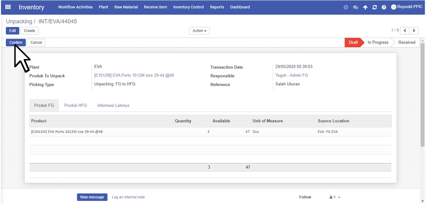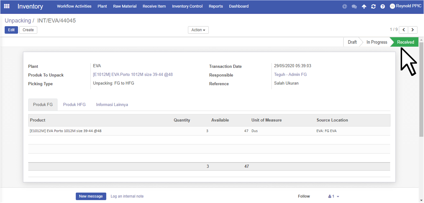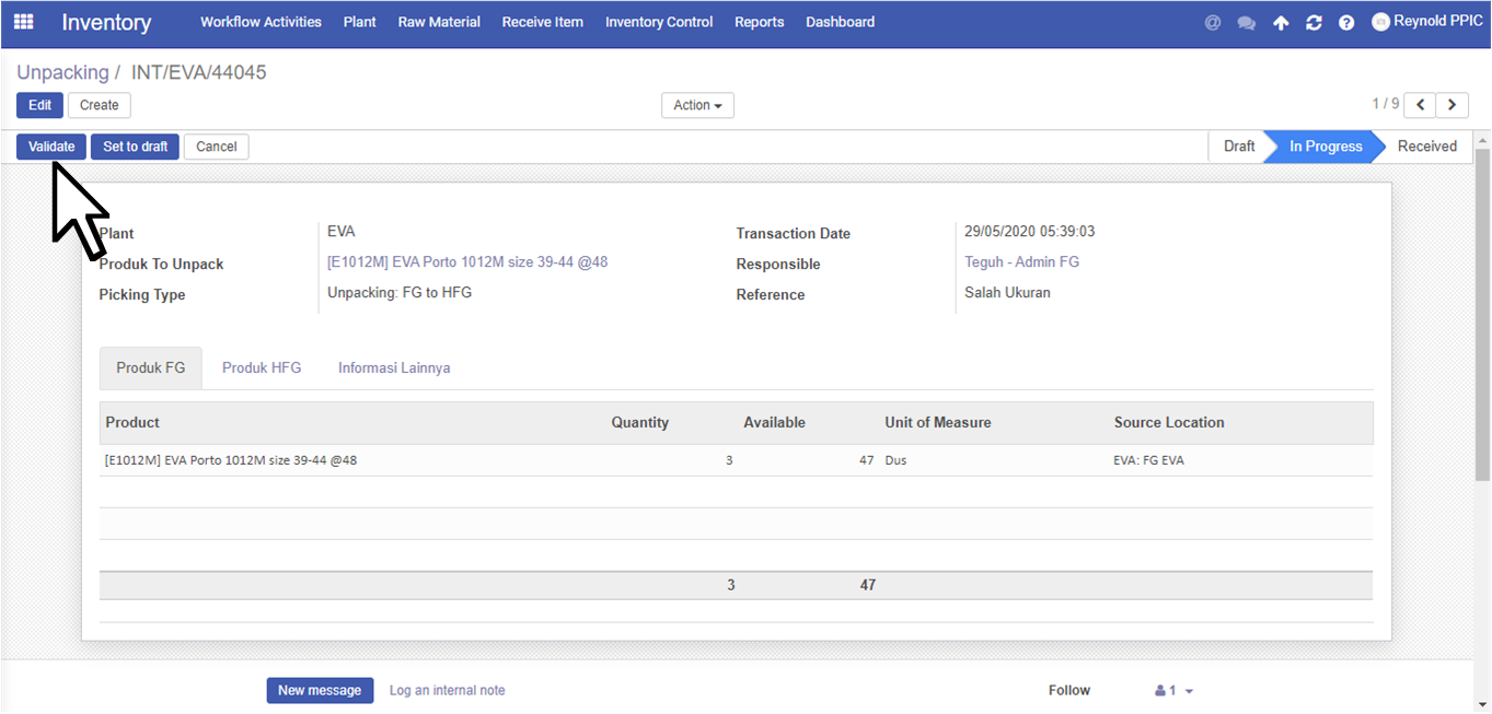 Status dokumen berubah menjadi In Progress dan User Plant Office click Validate untuk memvalidasi dokumen