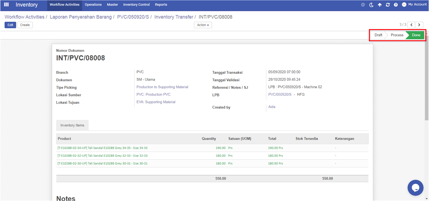 Status dokumen menjadi Done (stock masuk ke Gudang SM EVA)