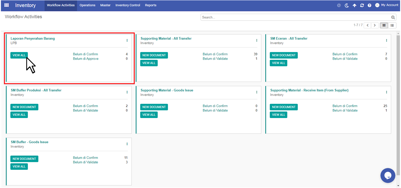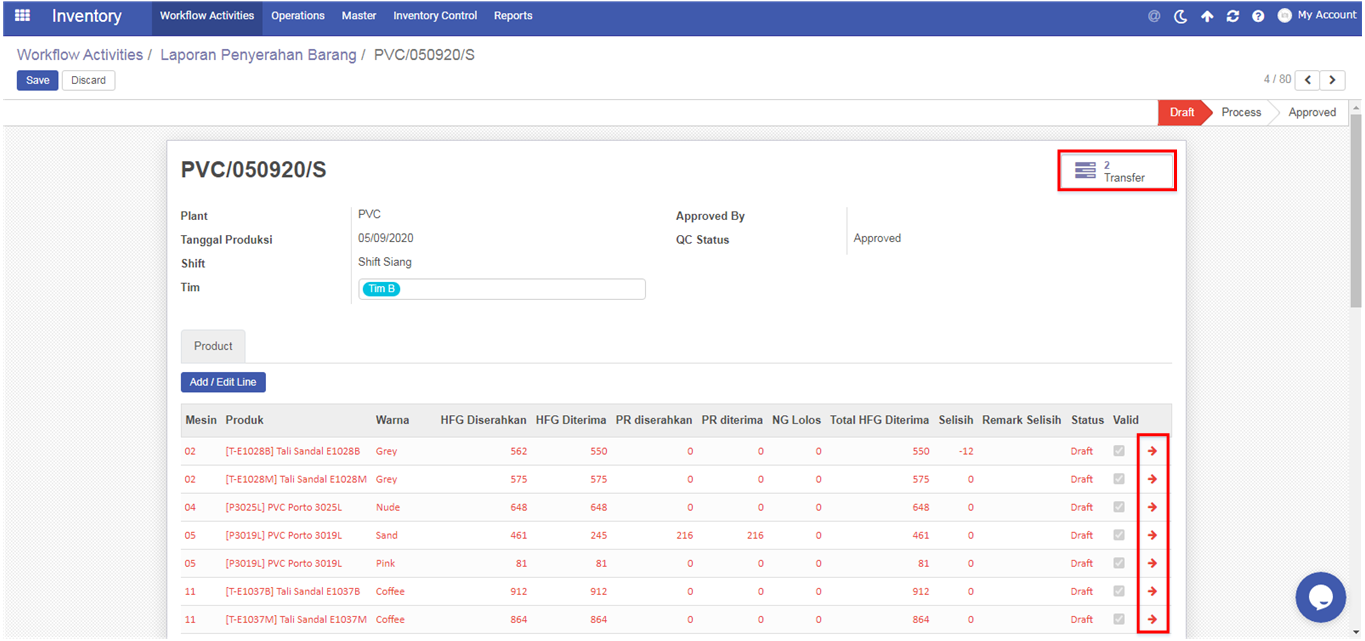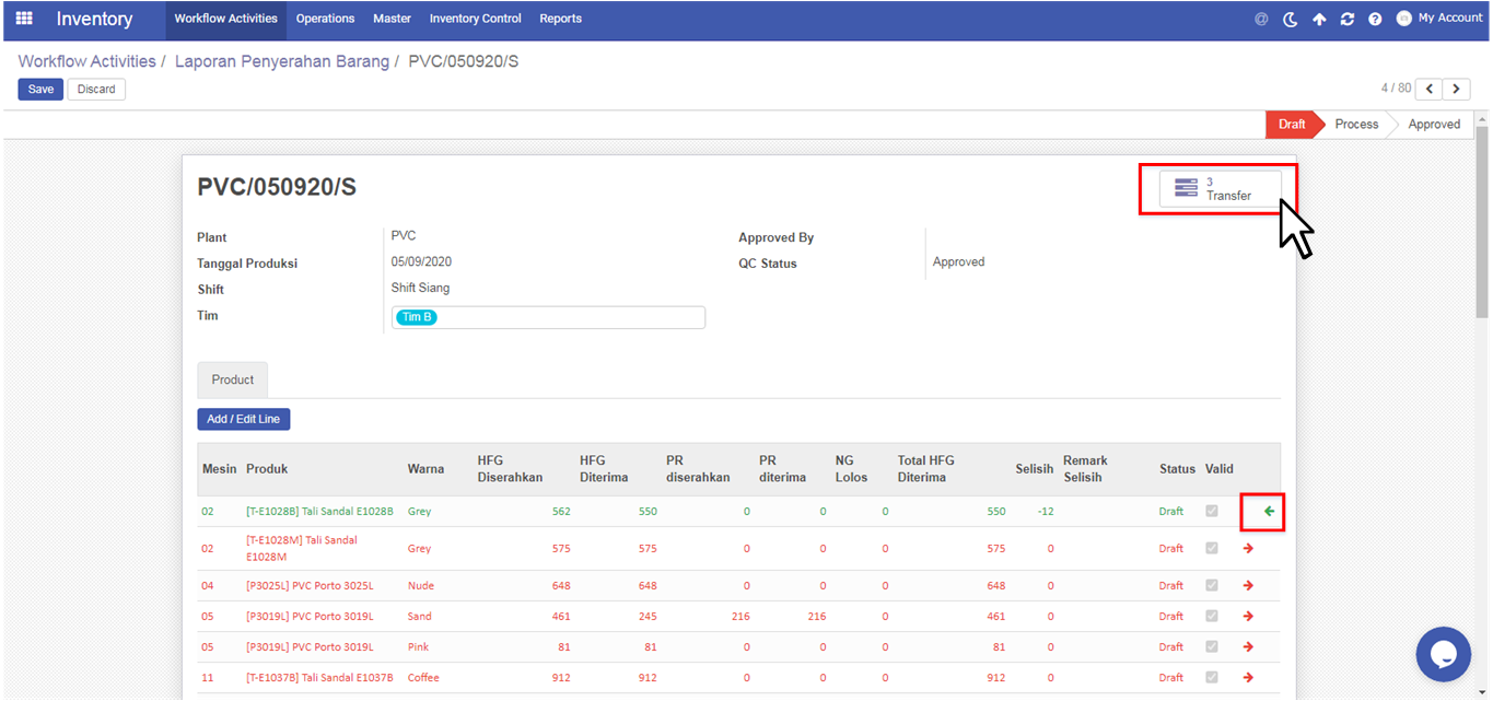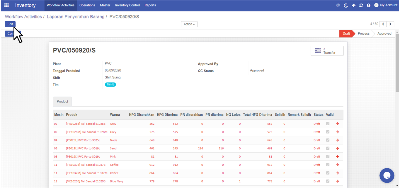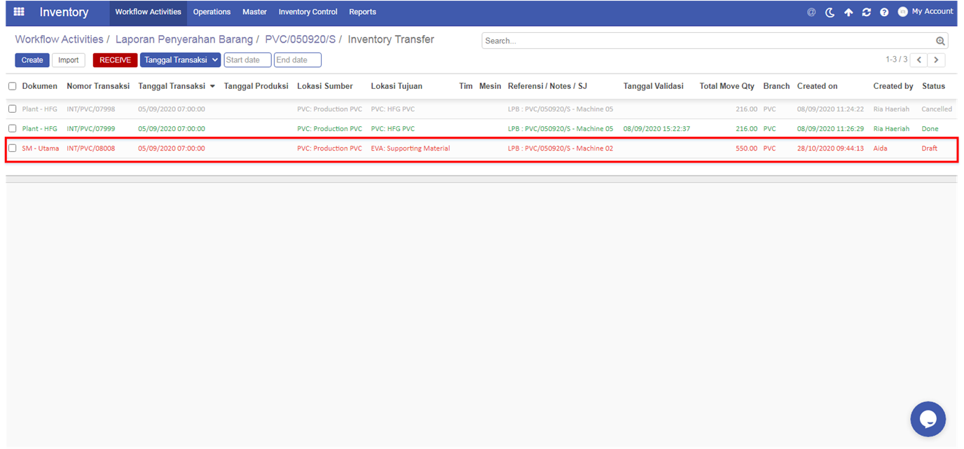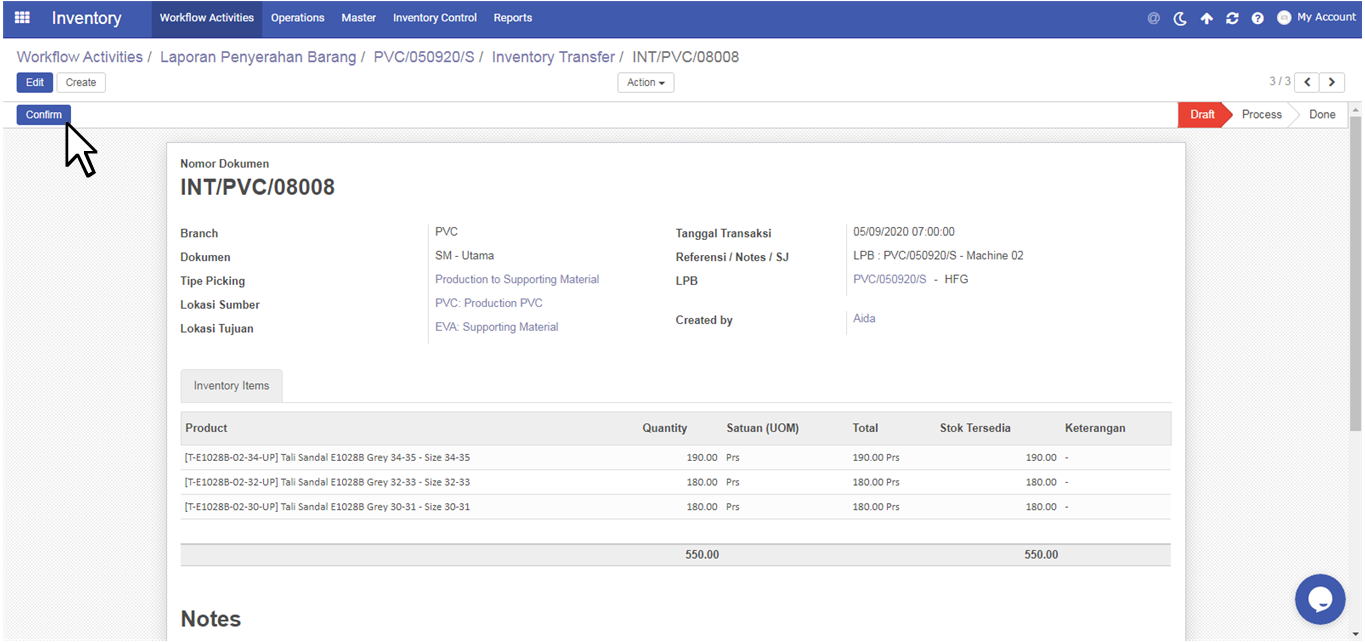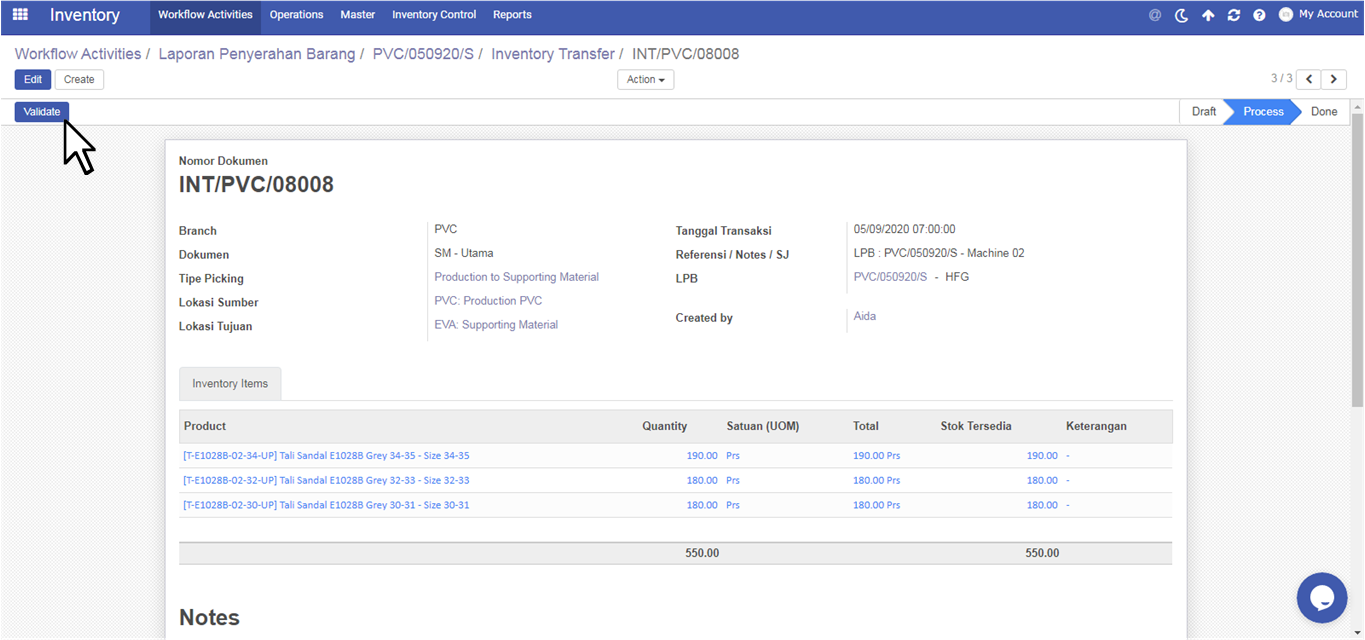 Selanjutnya User Confirm dan Validate supaya stock masuk ke EVA : Supporting Material (Gudang SM EVA)