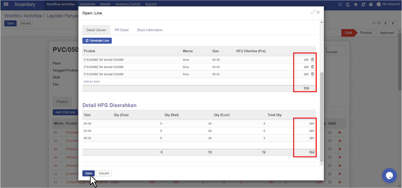 Pada Guide ini contoh Produk (Qty : 550) dan Detail HFG diserahkan (Qty : 562) berbeda dengan fisik