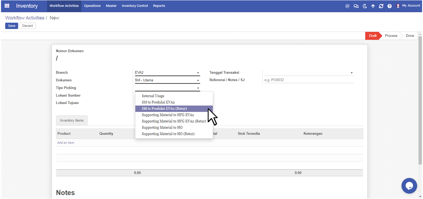User pilih Tipe Picking SM to Produksi EVA2 (Retur)