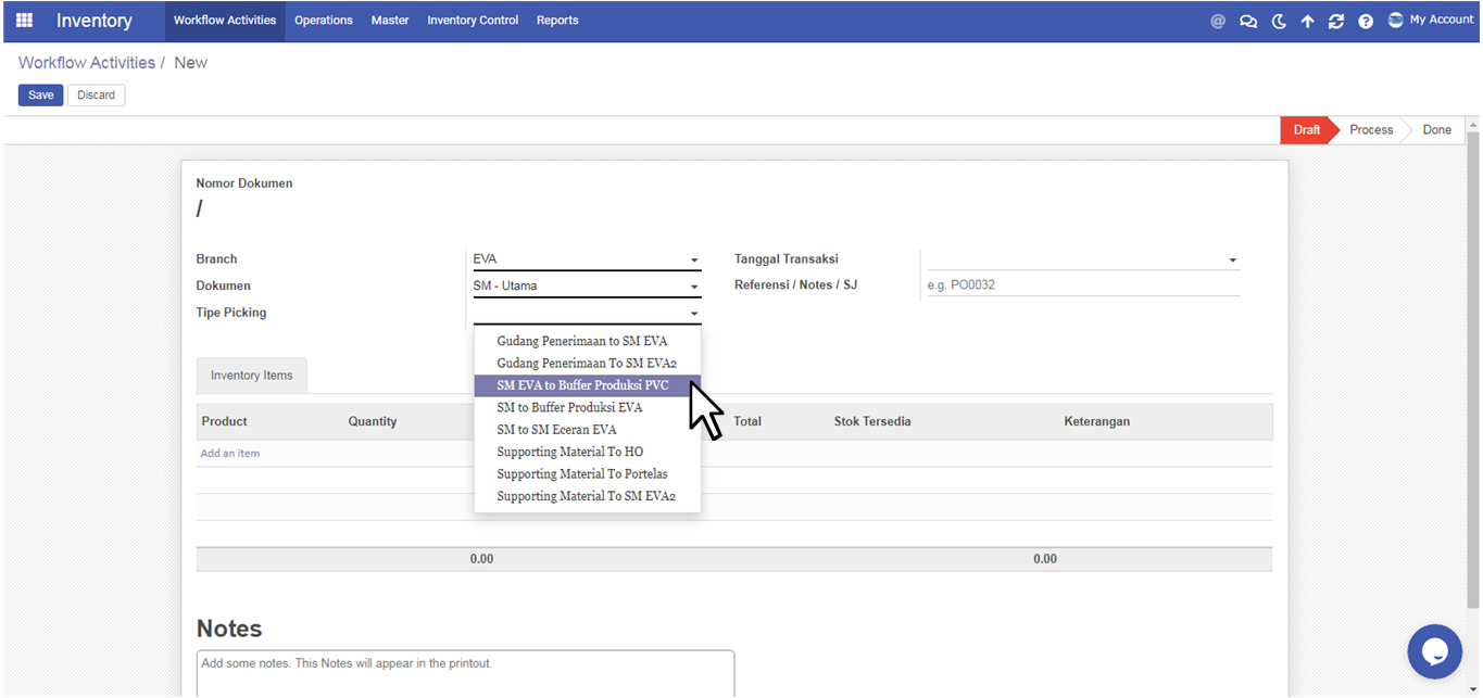 Case : Permintaan untuk Produksi PVC, maka Gudang SM EVA akan mengeluarkan/transfer ke Buffer Produksi PVC. Item yang ditransfer tersebut merupakan dalam satuan baku