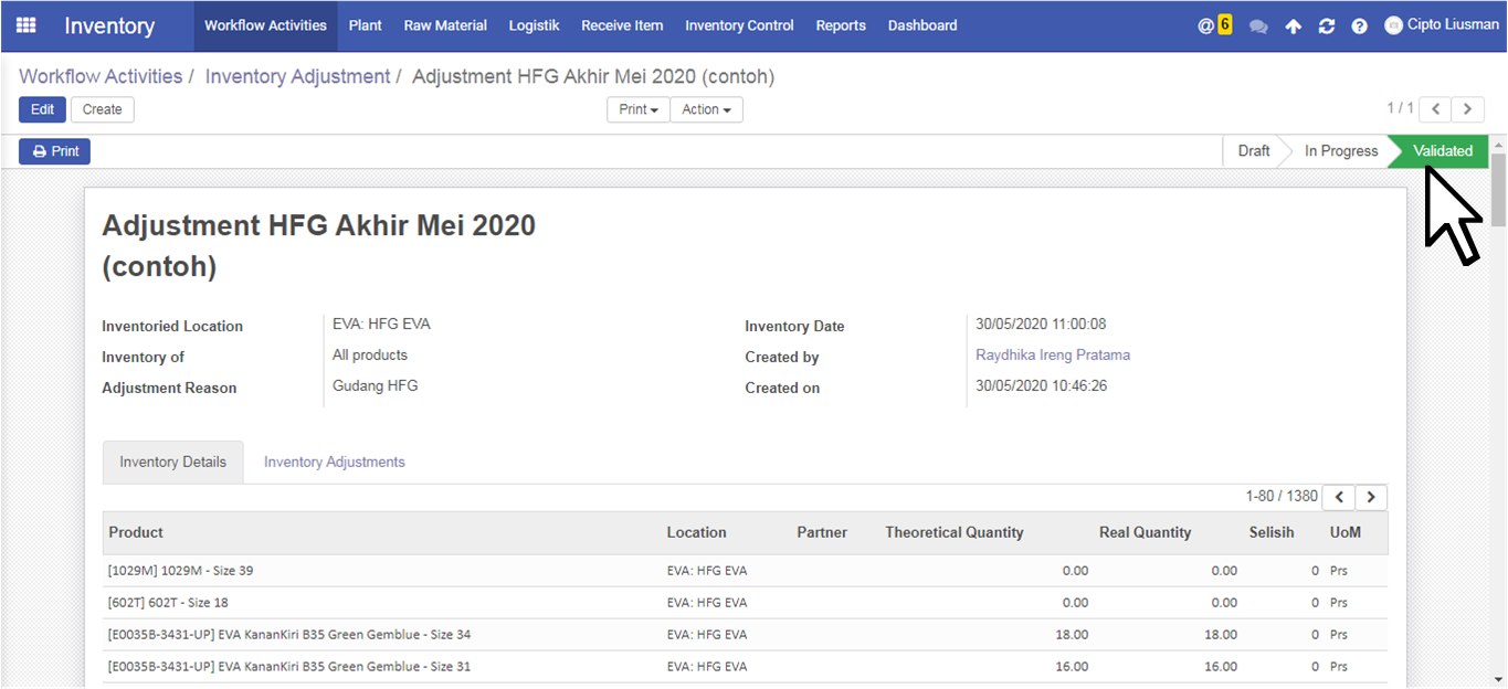 Selanjutnya merupakan tugas dari Direksi untuk Confirm dan Validate dokumen Inventory Adjustment