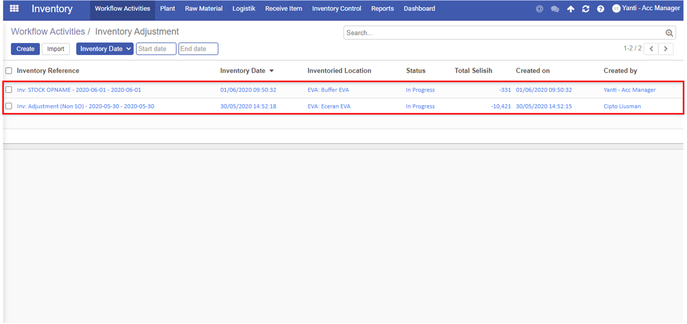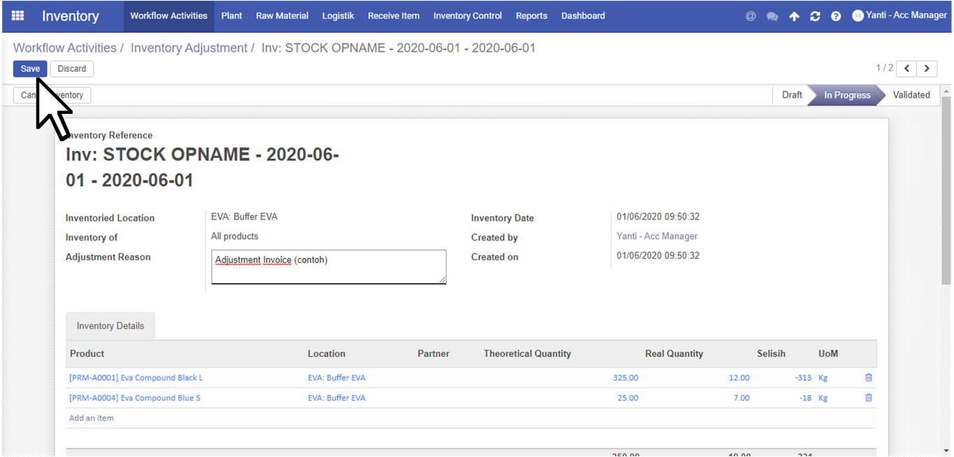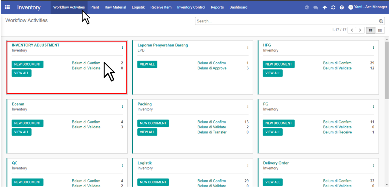 Manager Accounting click Workflow Activities, kemudian pilh Inventory Adjustment dan click Belum di Confirm