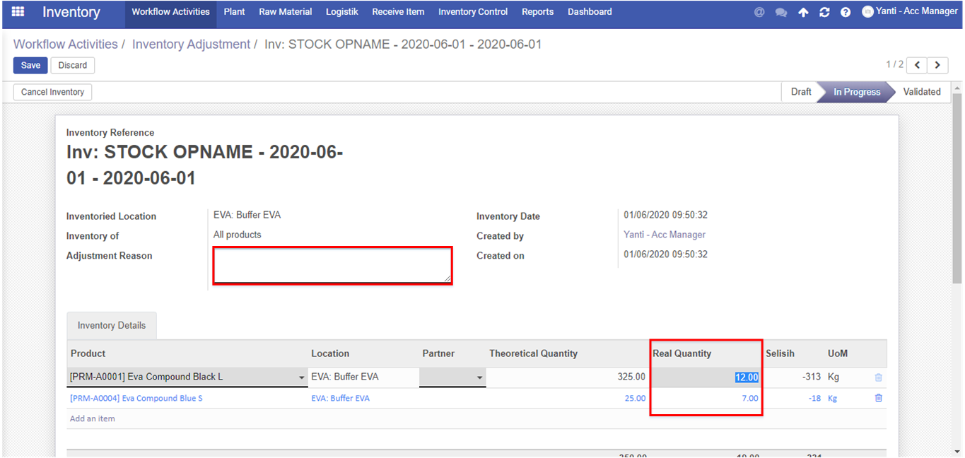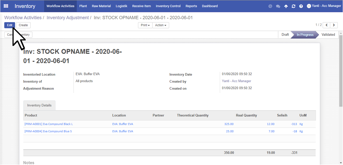 Manager Accounting click Edit untuk menyocokan antara barang antara Theoretical Quantity (barang yang terdapat pada sistem) dengan Real Quantity (barang yang terdapat pada gudang) dan mengisikan Adjustment Reason (Alasan Adjustment). Manager Accounting hanya dapat mengedit Real Quantity