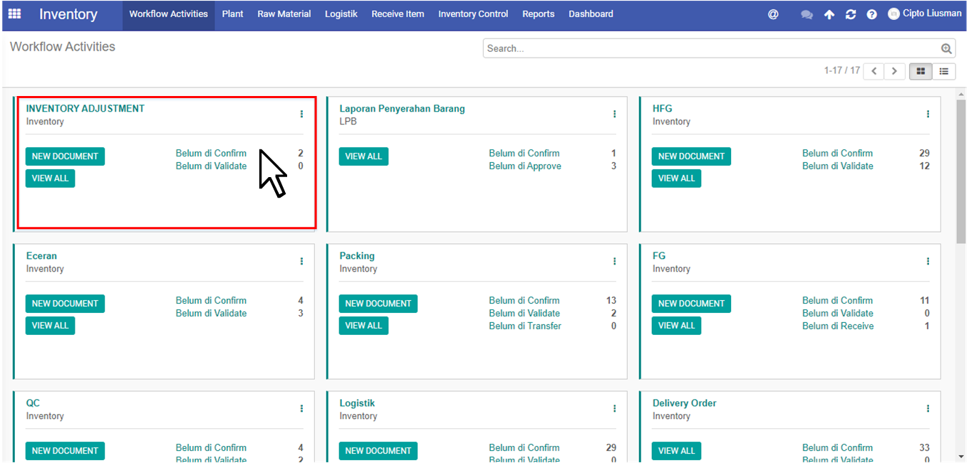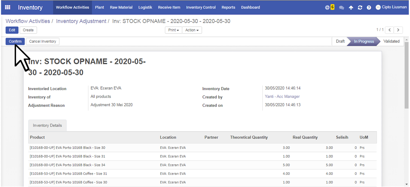 Direksi click Workflow Activities pilih Inventory Adjustment dan click Belum di Confirm