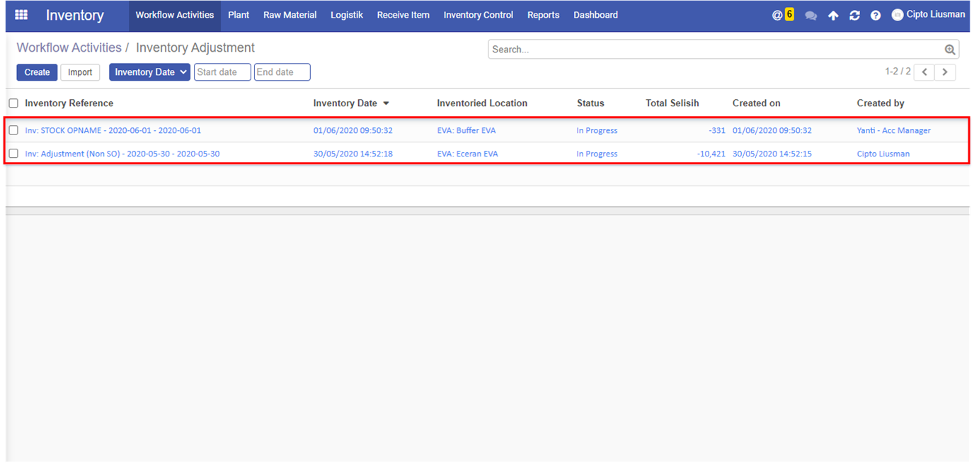Manager Accounting pilih pada dokumen Inventory Adjustment (dalam contoh ini yang atas adalah Inventory SO dan yang bawah Inventory Non SO). Pada kasus ini Manager Accounting click pada dokumen Inventory SO (yang atas)