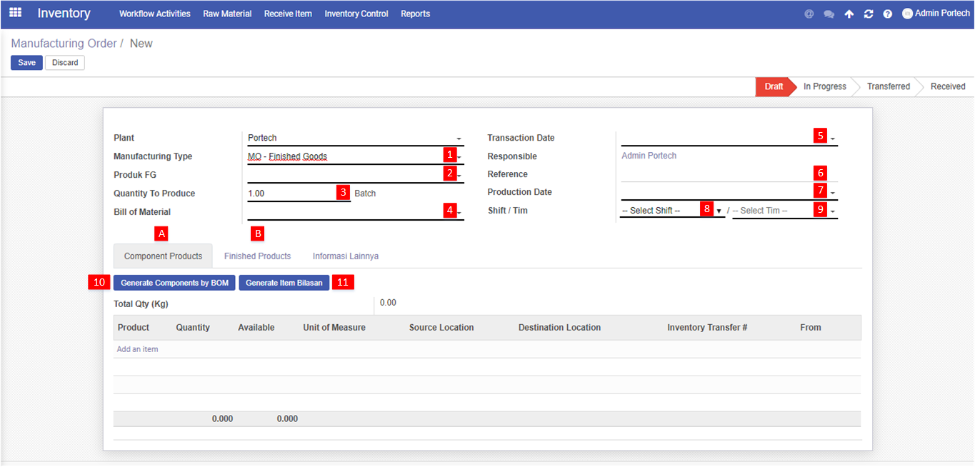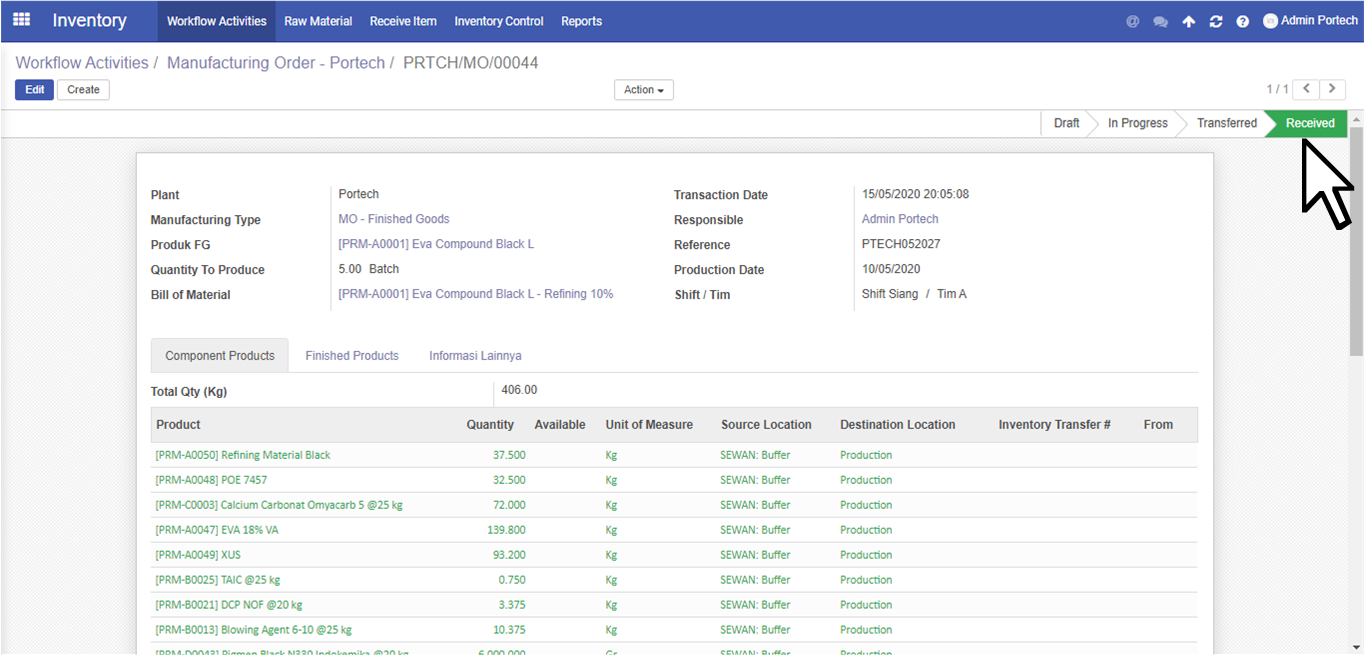 Apabila user menemui tulisan merah dalam list product bagian bawah berarti stock kurang dari yang diminta. User dapat melakukan transfer terlebih dulu melalui All Transfer - RM Portech to Buffer