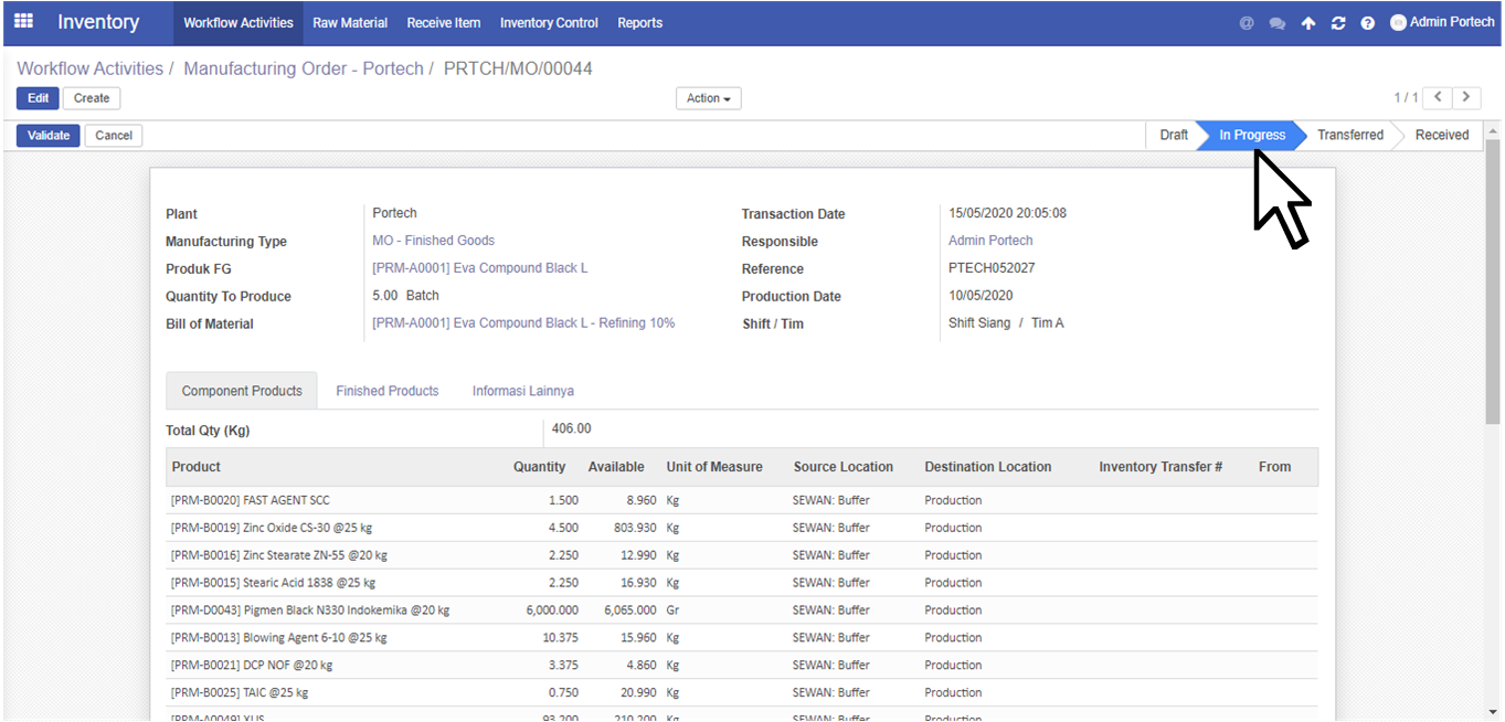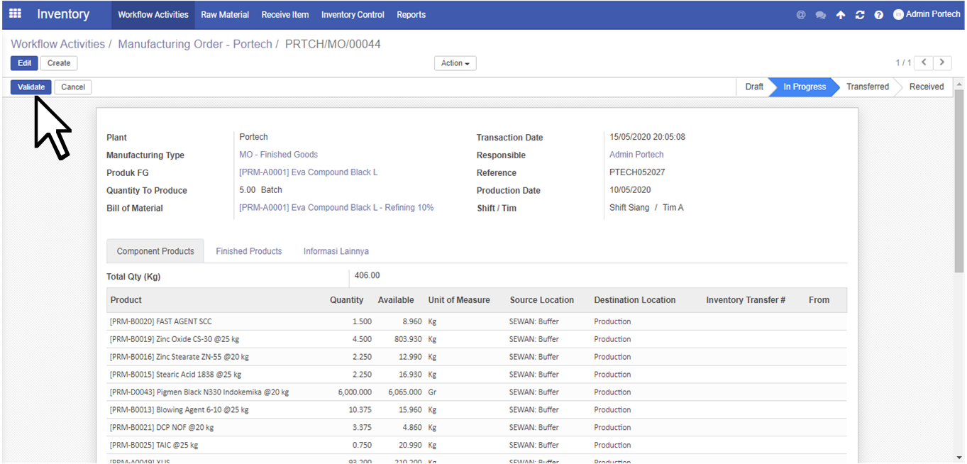 User click Workflow Activities, kemudian pilih Portech - Manufacturing Order (dalam kotak merah) dan click Belum di Validate