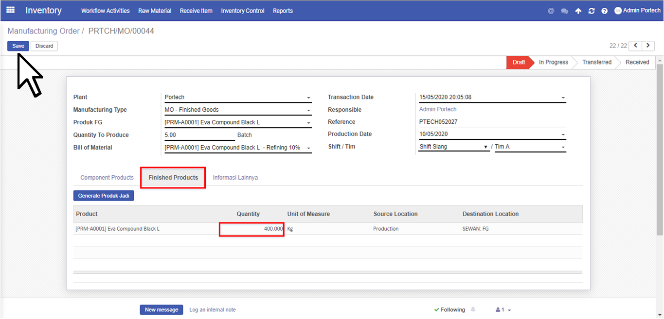Kemudian User dapat click Save pada pojok kiri atas dan status dokumen masih tetap Draft