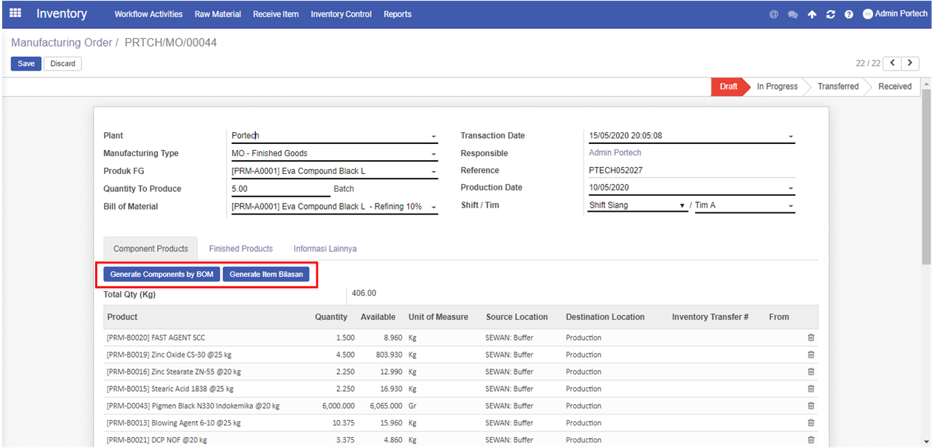 Ketika user telah selesai input field pada bagian atas, kemudian user click Generate Components by BOM dan click Generate Item Bilasan (Opsional) jika ingin menggunakan item bilasan