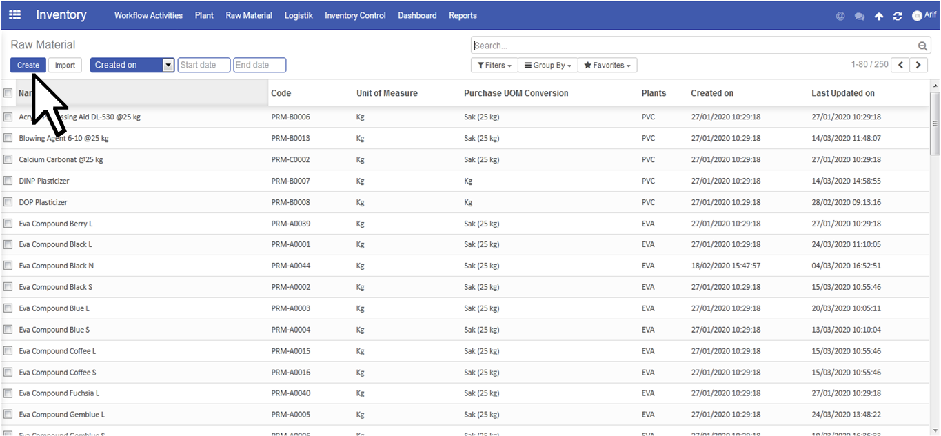 Plant Manager click Create untuk pembuatan Produk baru
