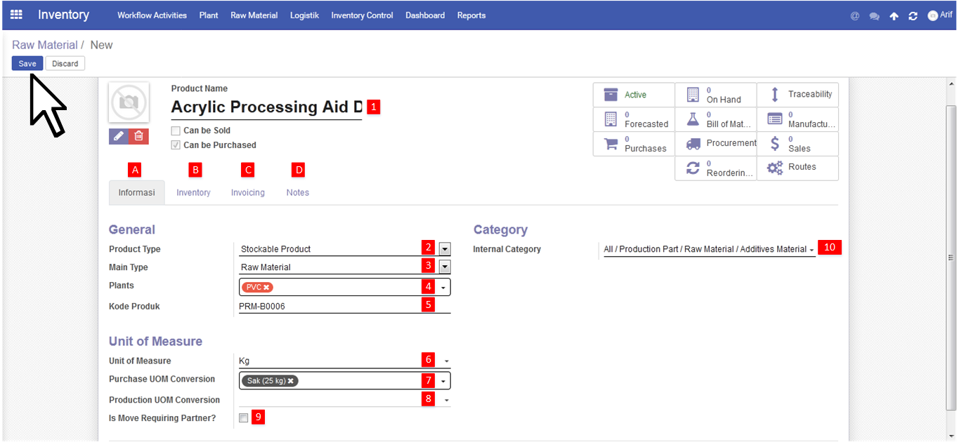 - Unit of Measure adalah satuan baku yang akan digunakan pada bahan baru yang bersangkutan. Terdapat banyak pililhan menyesuaikan bahan tersebut dan harus diisi
