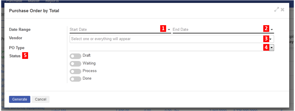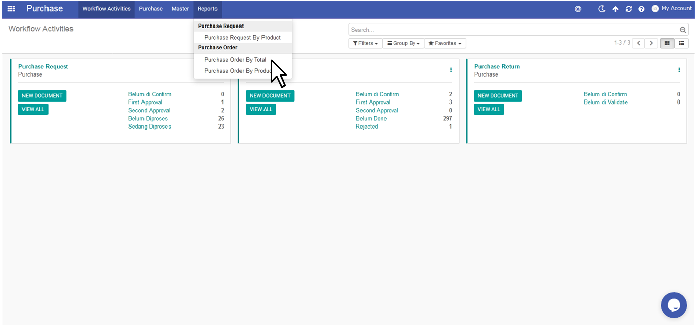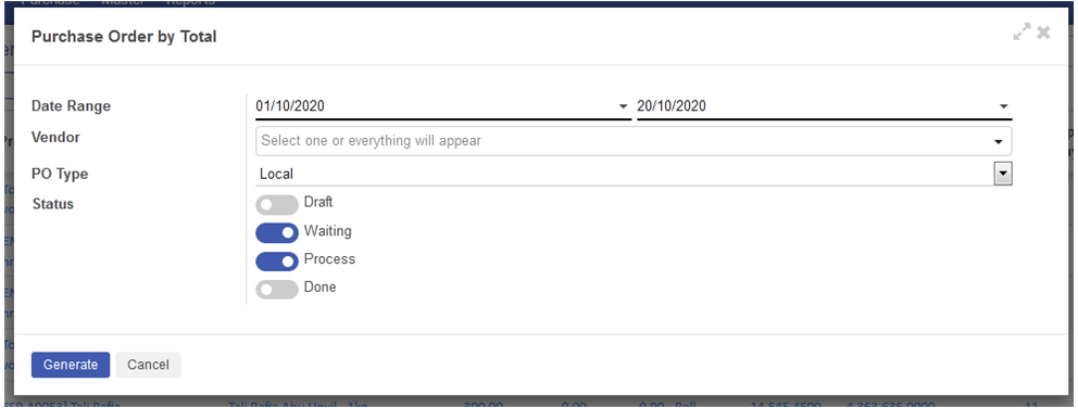 Report Purchase Order by Total dapat dilakukan oleh Purchasing untuk mengetahui detail dari POnya berdasarkan nama Vendor. Berikut adalah tahapannya