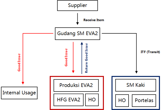 - Inbound From Supplier → menerima kiriman barang dari supplier dengan lokasi tujuan Gudang Penerimaan (EVA & PVC) dan Gudang SM - Utama (EVA2)